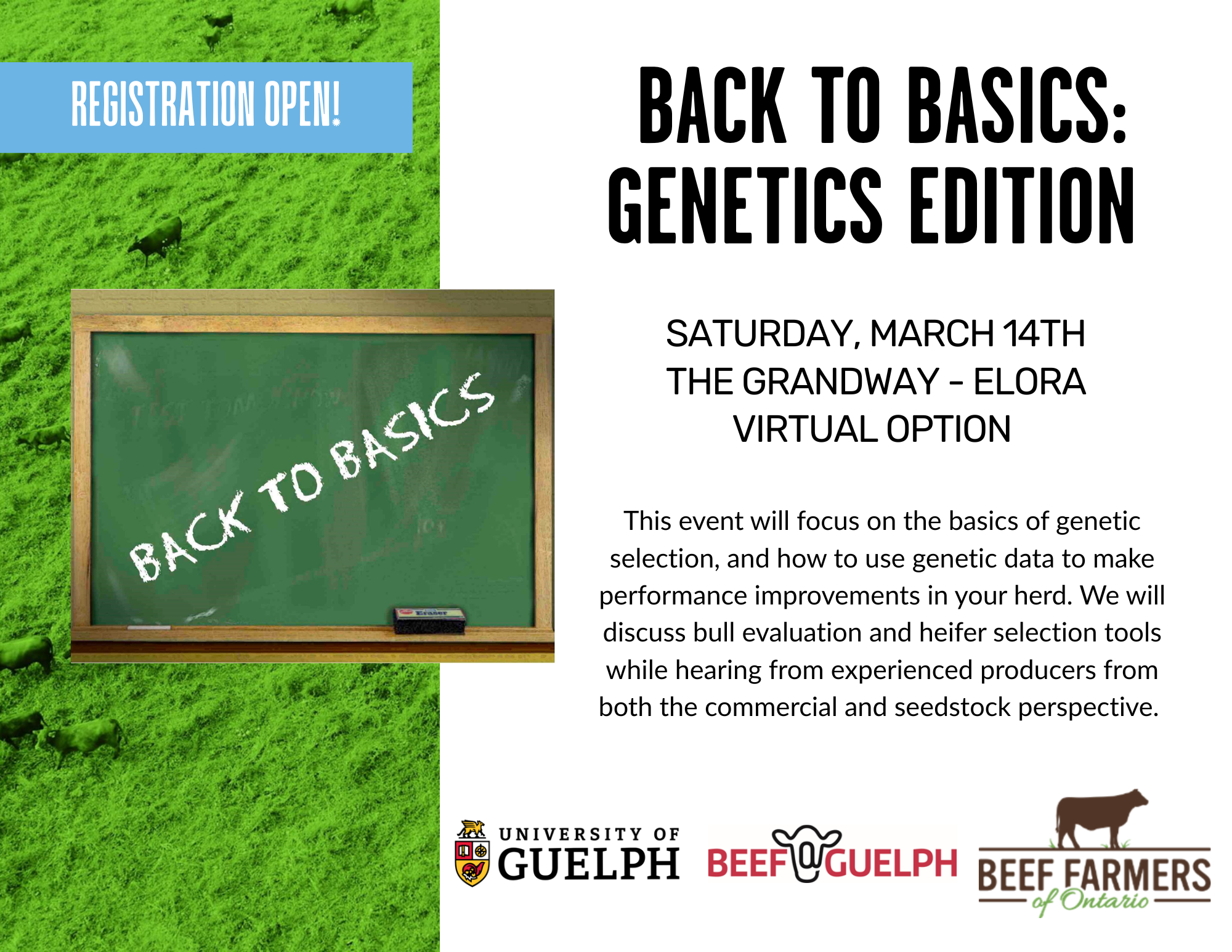 With so many things out of producers' control, this event will bring producers back to the basics of beef cattle genetics to improve the quality and marketability of their calf crop. Discussions will focus on how to use genetic data to help make performance improvements in your herd. Experienced seedstock and commercial producers will share about bull and heifer selection, along with a vet session on the importance of breeding soundess exams.